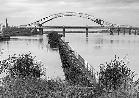 To me it seems like there are two subjects - the stairs and the bridge. In my revision I eliminated the stairs and most of the brush. I also cropped some off the left and from the sky and also darkened the sky. |