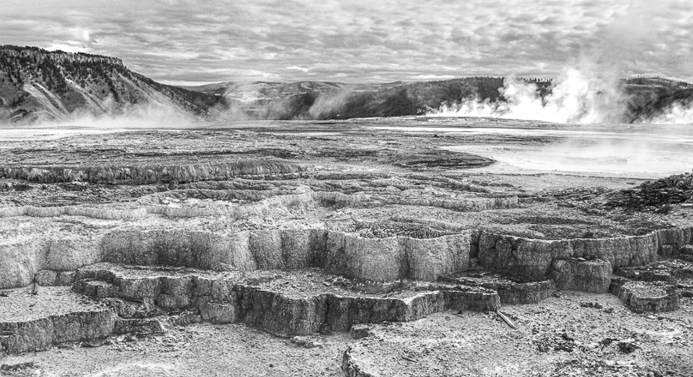 I like the image but feel that overall it is too dark especially the mountains. I also feel that the foreground should be cropped as it is not as interesting as the rest of the image. So, in my revision I started with your image 1 and converted it to mono. Then I cropped the foreground, increased the canvas size and enlarged the mountains. Then I dodged the shadow areas and also the steam areas. |