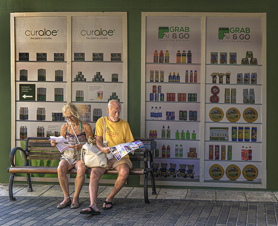 Brenda, thanks for your comments. The original photo shows that the couple are elderly and both with skin problems. I sharpened the submitted photo at only .4 pixels but which perhaps did accentuate their skin problems. So I went back and selected the couple and sharpened at .2 pixels, which did soften their skin, and then sharpened everything else at .4. My revised photo follows. |