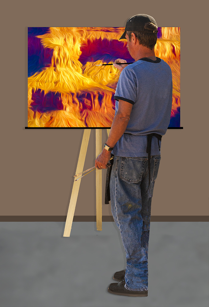 Mike thanks for your suggestions. I reduced the size of the "painting" to a more realistic size and I have tried to make the image of the artist more realistic by adding shadows and softening edges. |