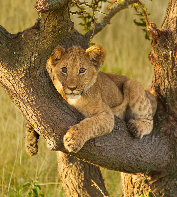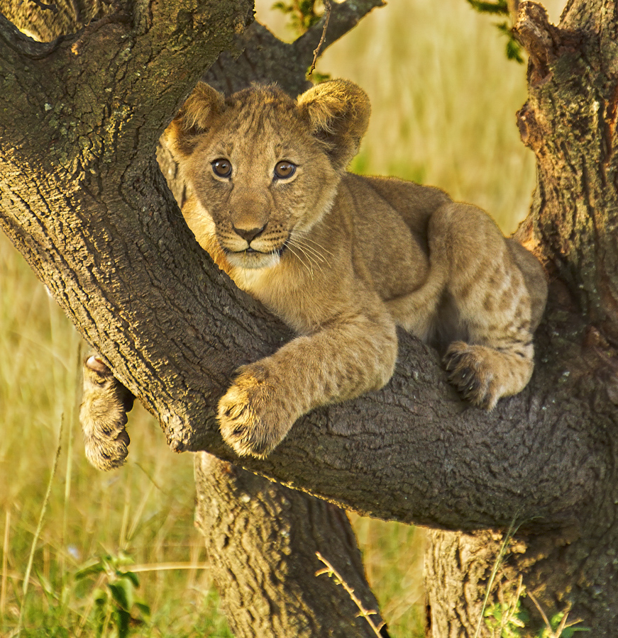 Brenda, I really like your latest crop as it eliminates most of the distracting background but I would still like to see the grass in the background darker. Did you try selecting just the background and then in Photoshop go to Image, Adjustment and Levels? Then use the middle slider to darken the selection. In my revision I did only that but then reversed the selection and used the sliders to brighten just the cub and tree but not the background. |