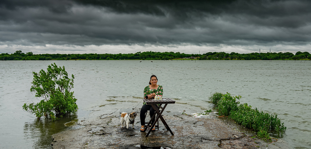 I like this very interesting photo a lot. A minor suggestion is to crop some off the sky so that the tree line does not divide the image in half and by so doing it results in more attention to your wife. |