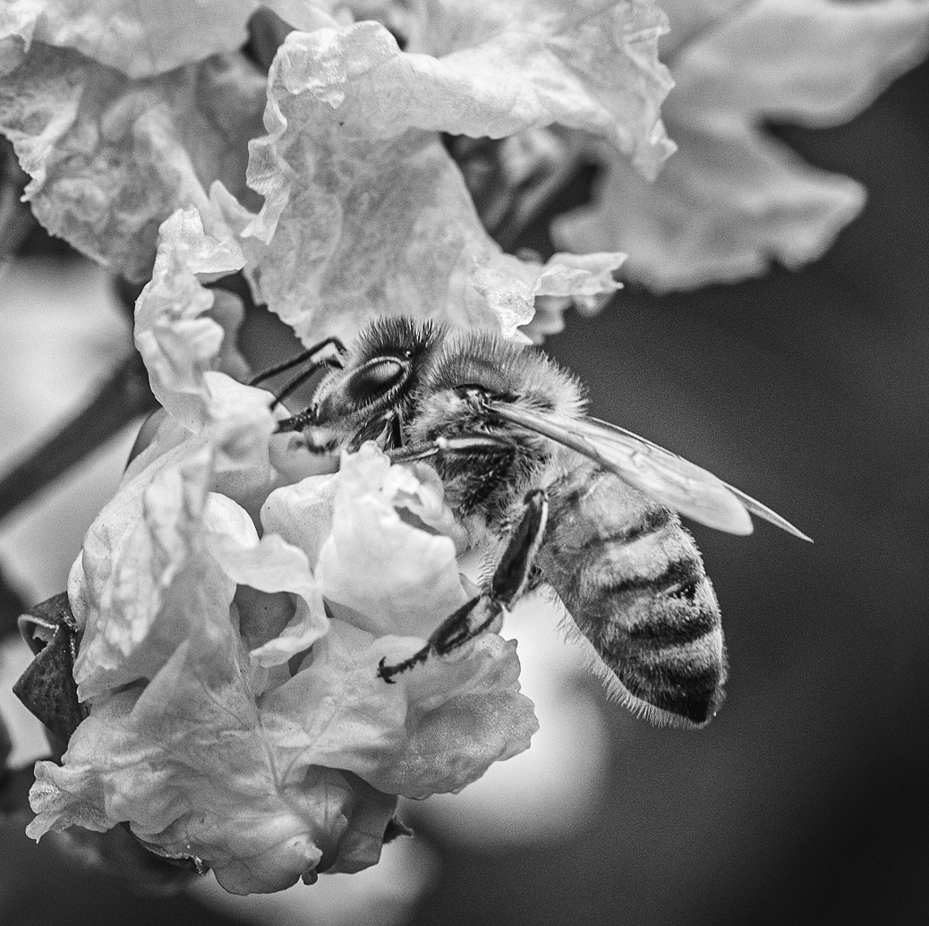 What a great shot and what outstanding sharpness! I like the mono image (but original 2 is also great). Since the subject of the photo is the bee I suggest a tighter crop and also a little more contrast. |