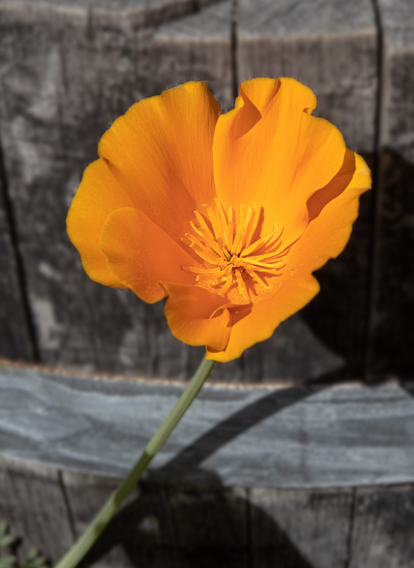 I like the original image with its vibrant orange color. I am bothered by the mono version in that the wood behind the blossom is in sharp focus while the wood below the blossom is blurred. In my revision I kept the nice sharp orange blossom but then blurred the wood behind it so that all the background has about the same amount of blur. I also cropped some off the top of the image and a slight amount from the right side. |