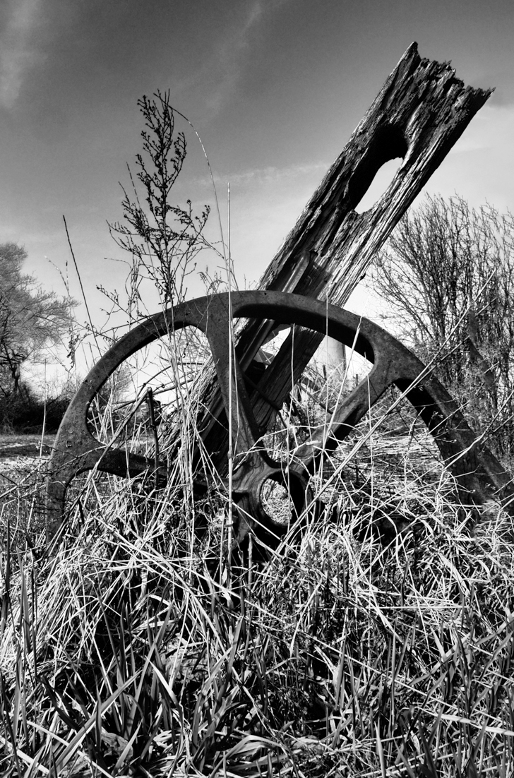 To me it seems that there are two images, the old windmill and the old wheel. In my revision I eliminated the windmill as, to me, it seems to distract from the image of the wheel. I also reduced the contrast slightly and cropped some off the left side. |