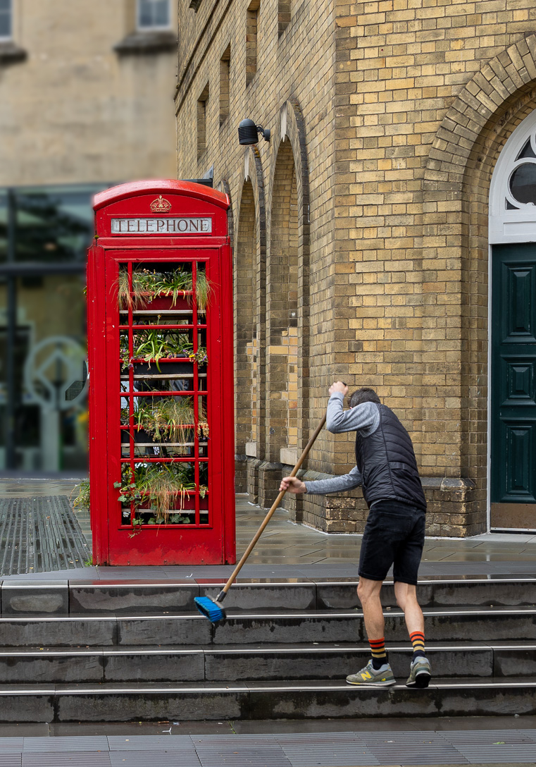 Terry, I like the image but feel the subject is the man and the phone booth. In my revision I cropped out much from the left side of the image, some from the bottom and much of the doors. I also selected and brightened the foliage inside the booth. I also darkened and blurred the area behind the booth so as to emphasize it moore. |