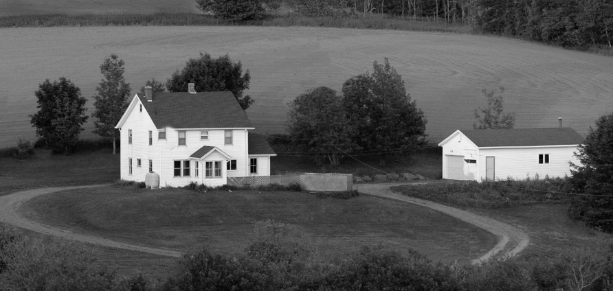 I like your image and the nice range of mono tones. However, I suggest that not all the area above the house is needed since the house is the main subject. In my revision I cropped out much of that area, cloned out the tree on the left and some of the tree in the field above the house. And, I darkened the remaining field area at the top of the image. And, another suggestion would be to crop out the building on the right and just focus on the main building.