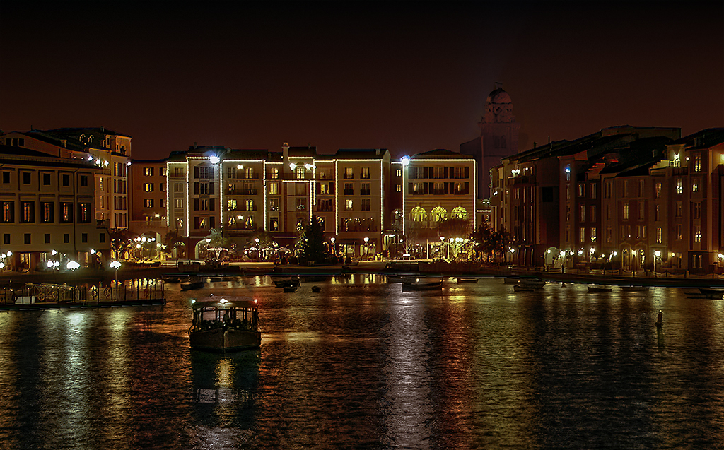 Many thanks for your comments. I went back to my original and used a gradient to reduce the noise in the sky and to make it appear as a sunset afterglow. I greatly reduced the brightness of the cathedral and improved its color. I reduced the brightness of the buildings increased their sharpness and, I darkened the water and boat.