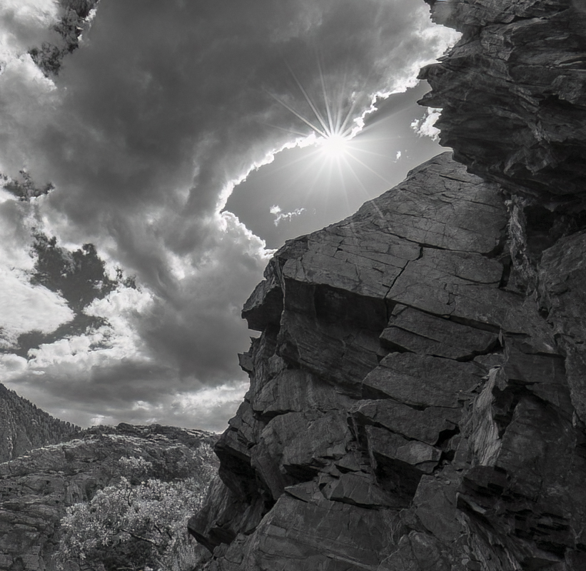 I like your conversion from the original. However, let me suggest an alternative. To me the area of most interest are the large rocks on the right side. So in my image I cropped out much of the left side to focus on the rocks and also the wonderful "S" curve of the clouds. |