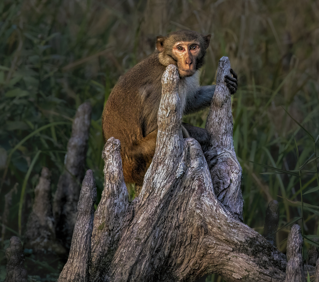 I love your outstanding image. Your crop is great as is your composition and the background is nicely blurred and darkened. My only suggestion is to reduce the brightness of the stumps and also just a little on the face of the monkey. They seem to bright, to me, given the dark background. |