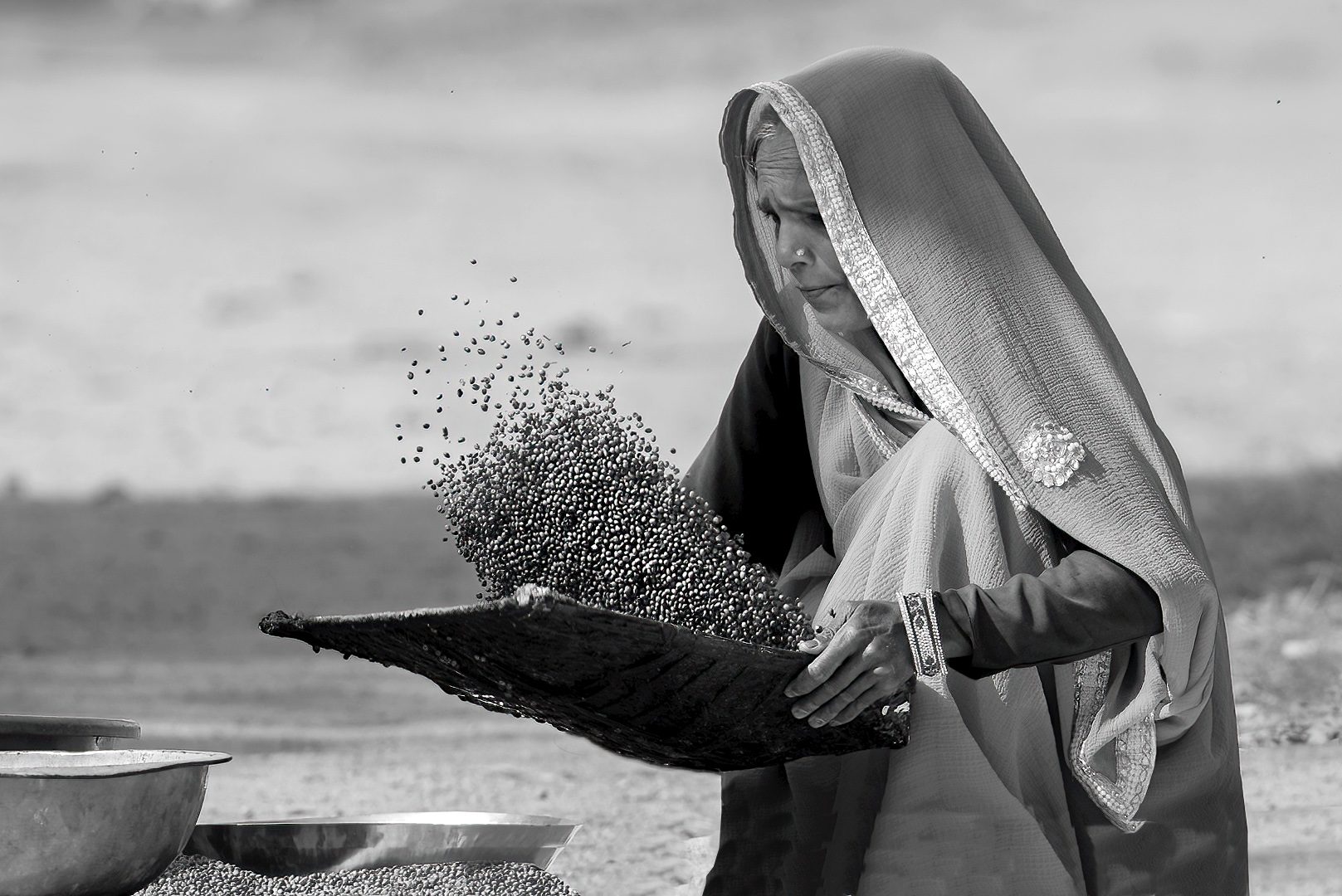 A wonderful image photographed at a precise moment. However, I am bothered by the large white object at the bottom of the image. So I cloned parts of the clothing to bring the garment down to cover the white object. I also cloned out some dark spots in the background. And, I also brightened the face and also the overall image. |