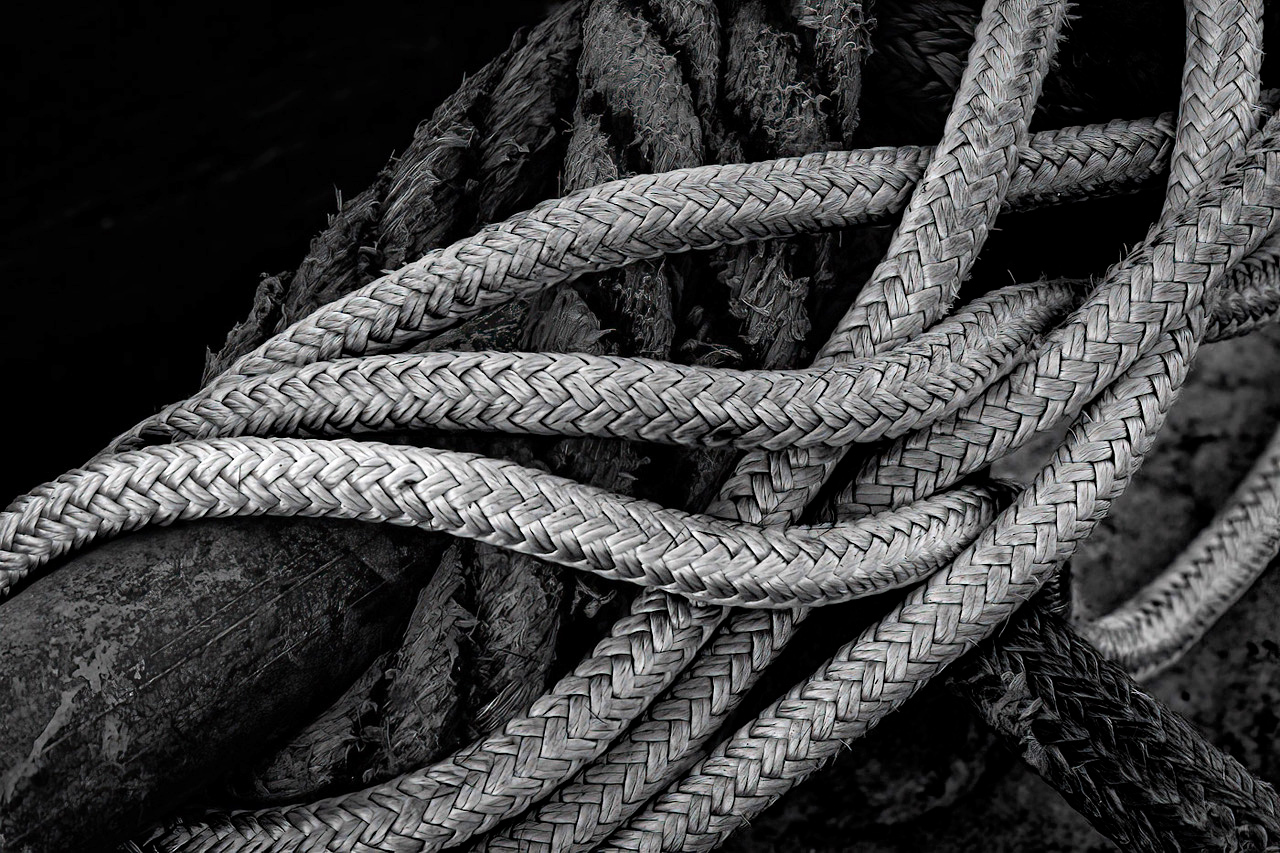 A very unusual image but to me it seems to lack a sense of direction and is somewhat flat. So in my revision I flipped the image horizontally and now like the way the image seems to flow from bottom left to top right. I then brightened the ropes but not the background. I also eliminated the black spot on one of the ropes. |