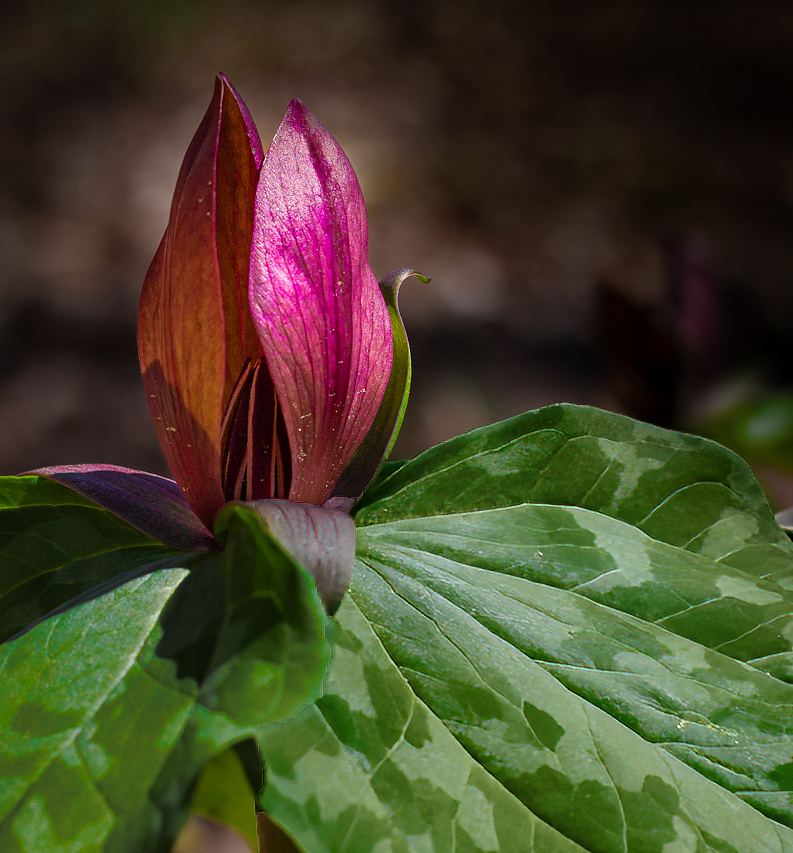 Nice image but I am bothered by the right leaf. It is somewhat soft and there appears to be something green showing from underneath the leaf. In my revision I sharpened the right leaf and darkened it. I then cropped the image so that the veins of the right leaf lead your eye up towards the blossom. My crop also moves the blossom away from the center of the image. |