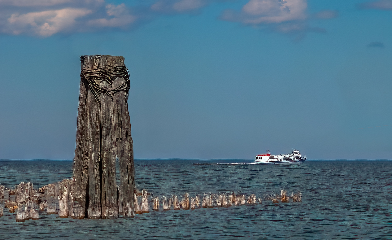 I really like your conversion from the original which did not have much contrast or interest. But, I wonder about the image of a boat sailing between two pilings. Let me offer an alternative, the boat sailing away. I removed one of the pilings, moved the boat further to the right, lowered the pilings, reduced the noise and cropped some off the top and bottom. |