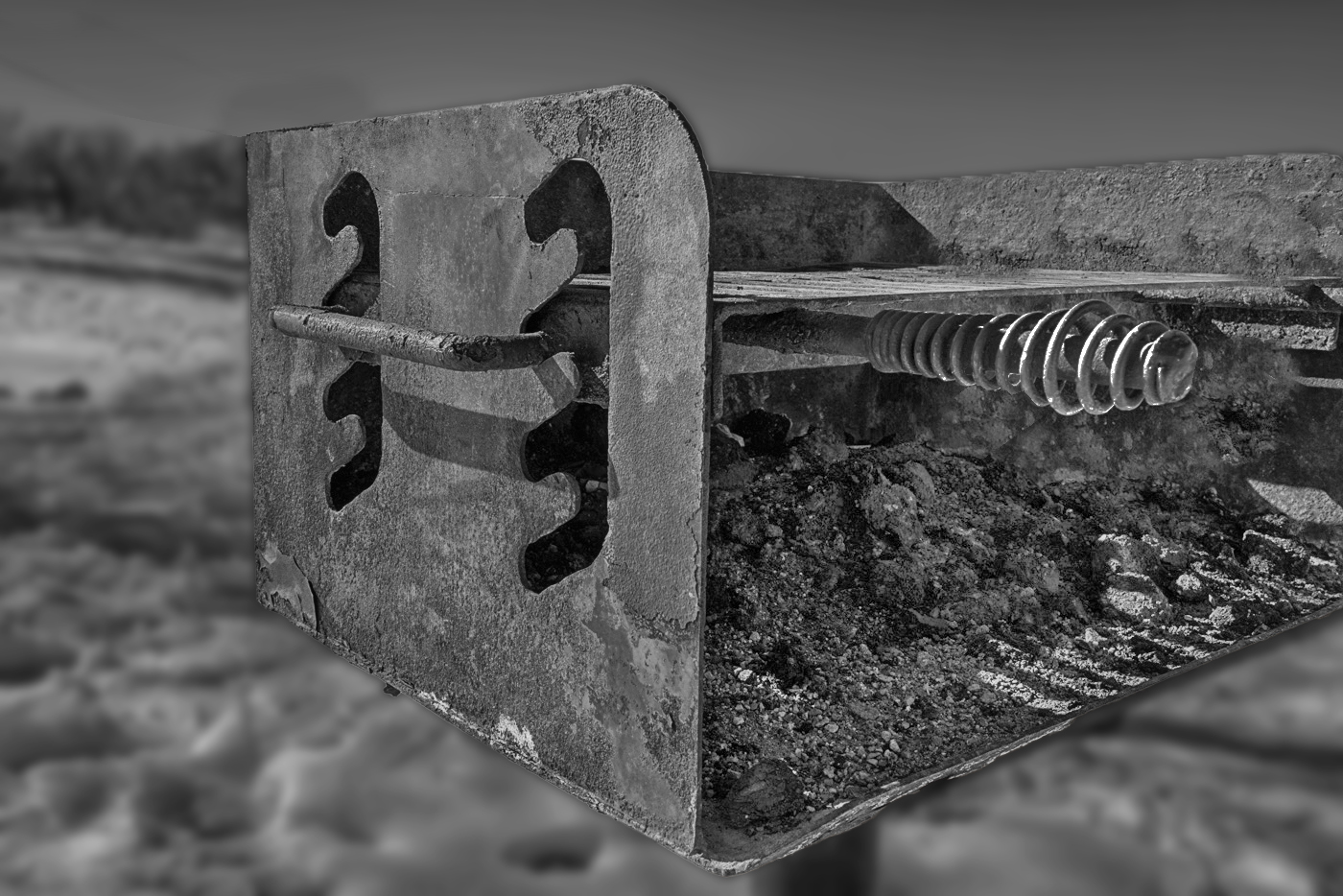 I like the conversion to mono from the original color image. But, in my opinion the problem with the image is that there are many items in the background that detract from the image of the grill. So, in my revision I deleted the grill in the background. And, I darkened the snow and then blurred the entire background. I also brightened the ashes in the grill as well as the coil.