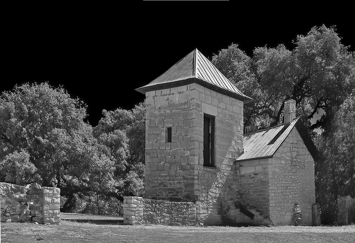 Very nice image and conversion from the original. It seems to me that the walls are sloping inward. I do not know if the walls really do slope but I assumed that the sloping is because the church was photographed with a wide angle lens. So, in my revision I straightened the angles, increased the contrast and darkened the sky slightly.