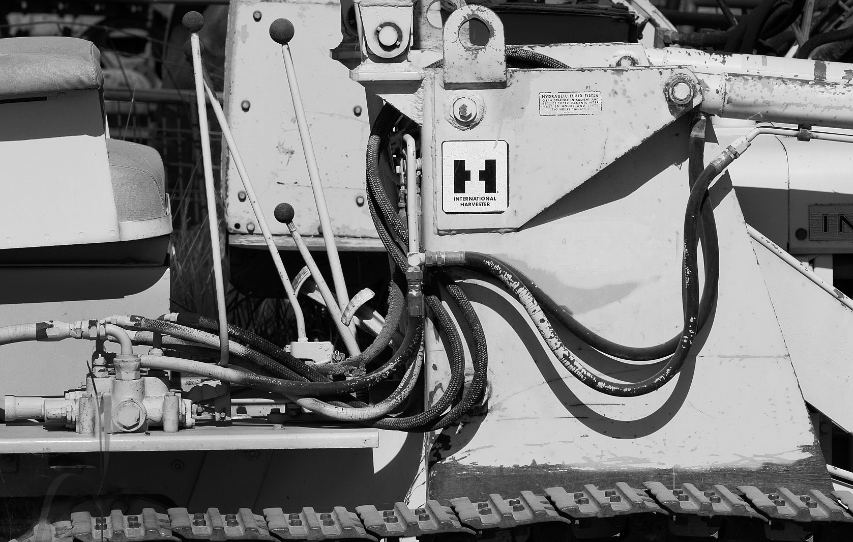I also think the hydraulic hoses are the most interesting part of the image. And, I like Christian's suggestion that some of the tracks should be in the image. So, I went back to the original, and in my revision I darkened most of the areas that were not part of the frame, shifters or tracks. I then cropped some off the top and front of the image. |