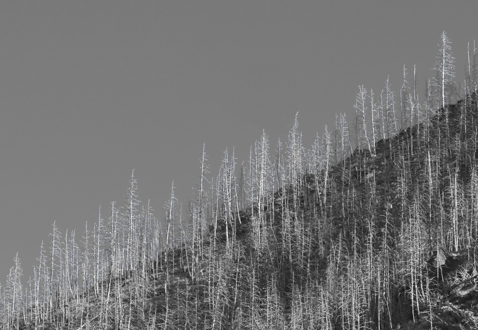 Ed your original image is an excellent capture of an unusual event but, to me, not as a photograph. I feel every photo should attempt to tell a story and I wonder what is the relationship of the moon to the trees. To me the story is the devastation of a forest fire which I've tried to capture in my revision. A possible title could be "After The Forest Fire." |
