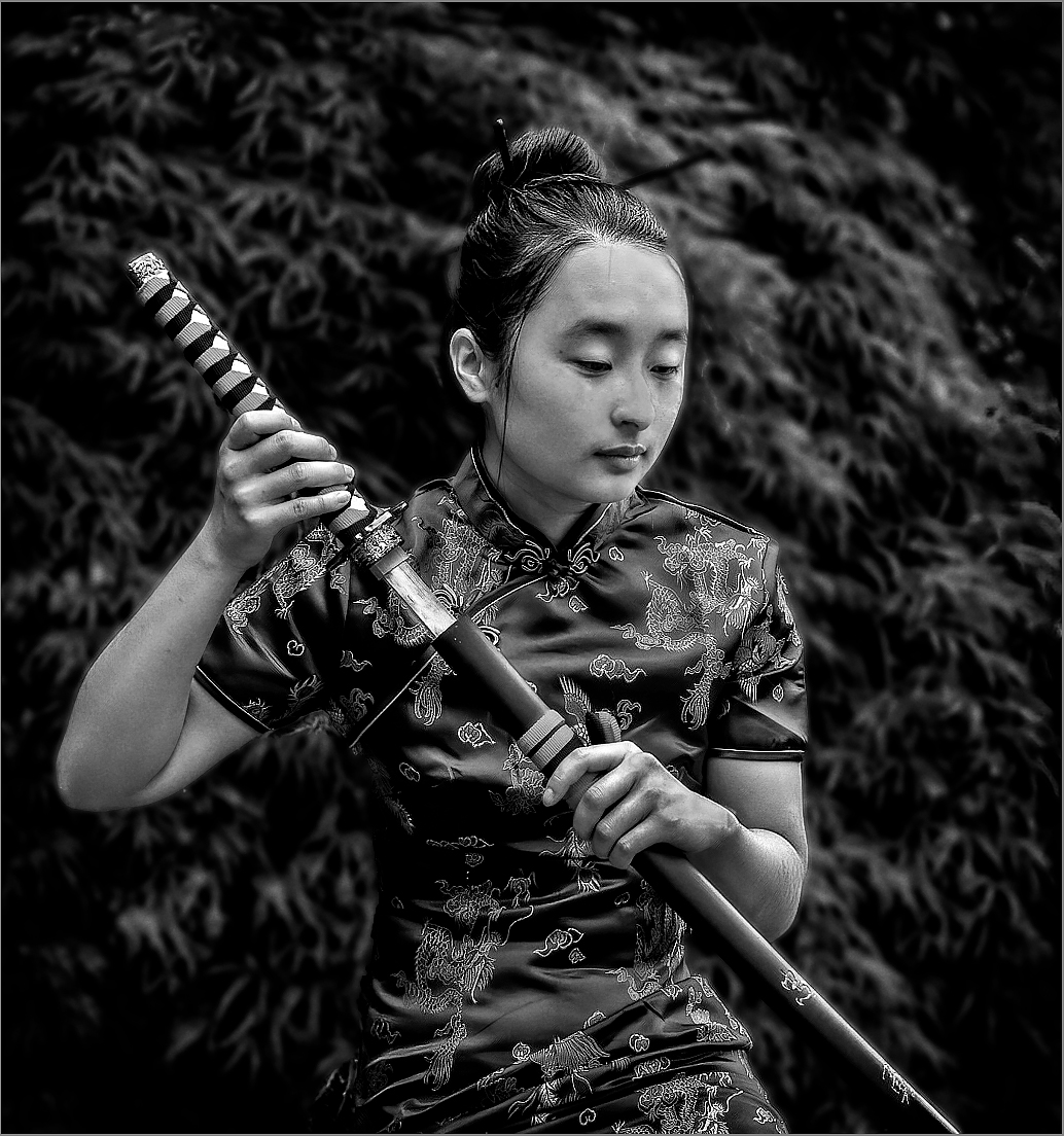 I like the image a lot. Cropping out the stone the subject is sitting on makes the composition great. Although the mono version is good, I prefer the color image. I made some changes in my revised mono revision. I removed the blemishes from the lady's face. I reduced the bright areas especially her left hand. I brightened some of the dark shadow areas of the background and then slightly blurred the entire background. I sharpened the subject. I changed to tone to a purer black. And, finally I added a small border. |