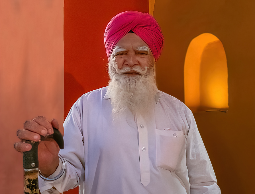 I think this is an outstanding image. I like the colors and the composition. However, to me, the brick work above his cane and elsewhere is distracting. In my revision I eliminated the brickwork, darkened the orange color, cropped tighter, brightened the face and beard and increased the sharpness. |