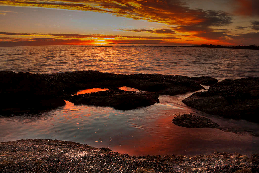 Great catch, Richard! Wonderful composition with the dark mask look and colorful sunset. I thought brightness of the sun and clear sky overpowered the rest of the scene, so I applied a graduated filter to bring down the exposure above the horizon and slightly brought up the shadows to add subtle definition to the dark rocks. |