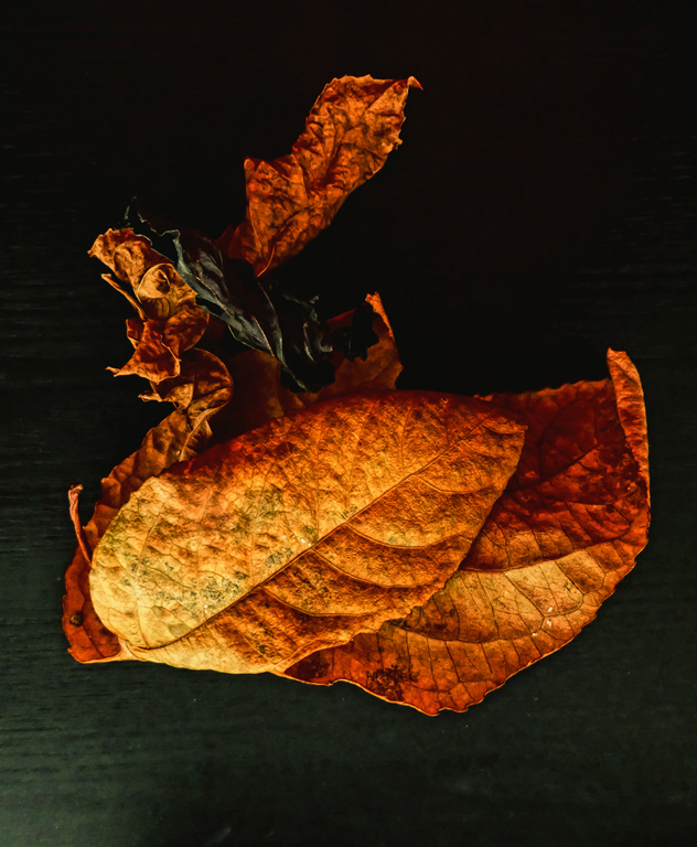 Yvonne, I love the color and texture of these leaves. They are stunning against the dark background. I was wondering what they would look like flipped, so I tried it. For me, flipping them allowed my eye to travel to an open space. Wondering what you and others think of this suggestion. |