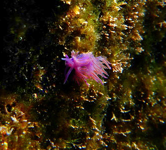 What a beautiful creature! I am wondering if you including more of the setting would improve this image. To me, the variations of color and texture complement the color and flow of the Flabellina affines. I took your original into Photoshop, selected the dark areas on the left and then adjusted them using Brightness & Contrast. I then cropped to include more color and texture of the surroundings. |