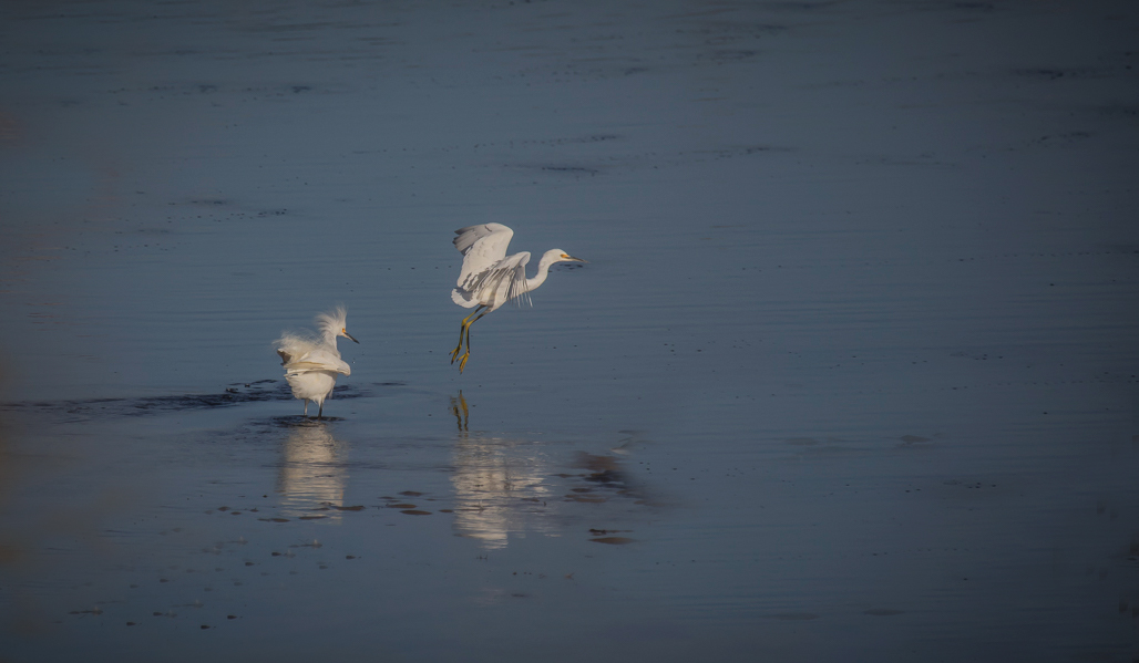 Thanks for getting the original up for us to see. What a wonderful capture of these two courting egrets. The reflection adds a lot to the beauty of the scene. I am wondering whether you where going for what appears to be the stylized effect or if it was a result of your editing. I've taken the liberty to try to capture the story without adjusting the birds themselves too much. Cloning out the leaves and areas that are distract may be a better option than cropping too much. I also added a vignette to help focus on the story being told. |