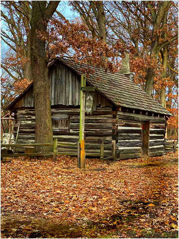 Kathleen, I think the colors, subject and textures in this image are wonderful. I do wish that it was you cropping this image horizontally which would give the cabin space to breath. Since that is not possible at this point, maybe playing with the idea of a hint of a path in front would tie the image together better. This is my feeble attempt at a path and adding some additional saturation. |