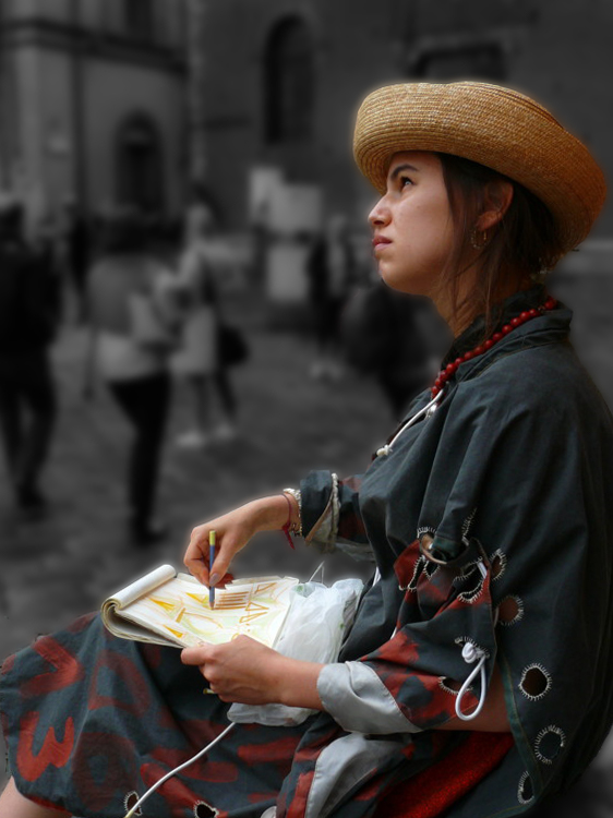 I can see why you love this image. She looks so serene... I so like the fact that she is showing us what she is drawing. This image definitely tells a story. Further blueing and change the background to black and white may enhance what you are trying to do. |
