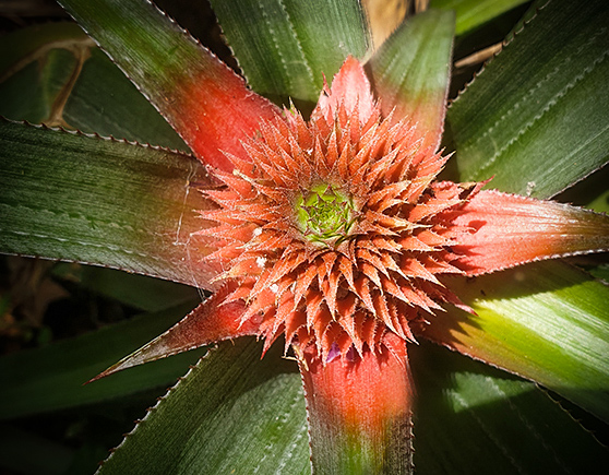 What an interesting perspective! The colors in the center are vivid which gives you a great contrast with the leaves. Flow is SHARP. I could not resist trying a slightly diffract crop and adding a vignette. |