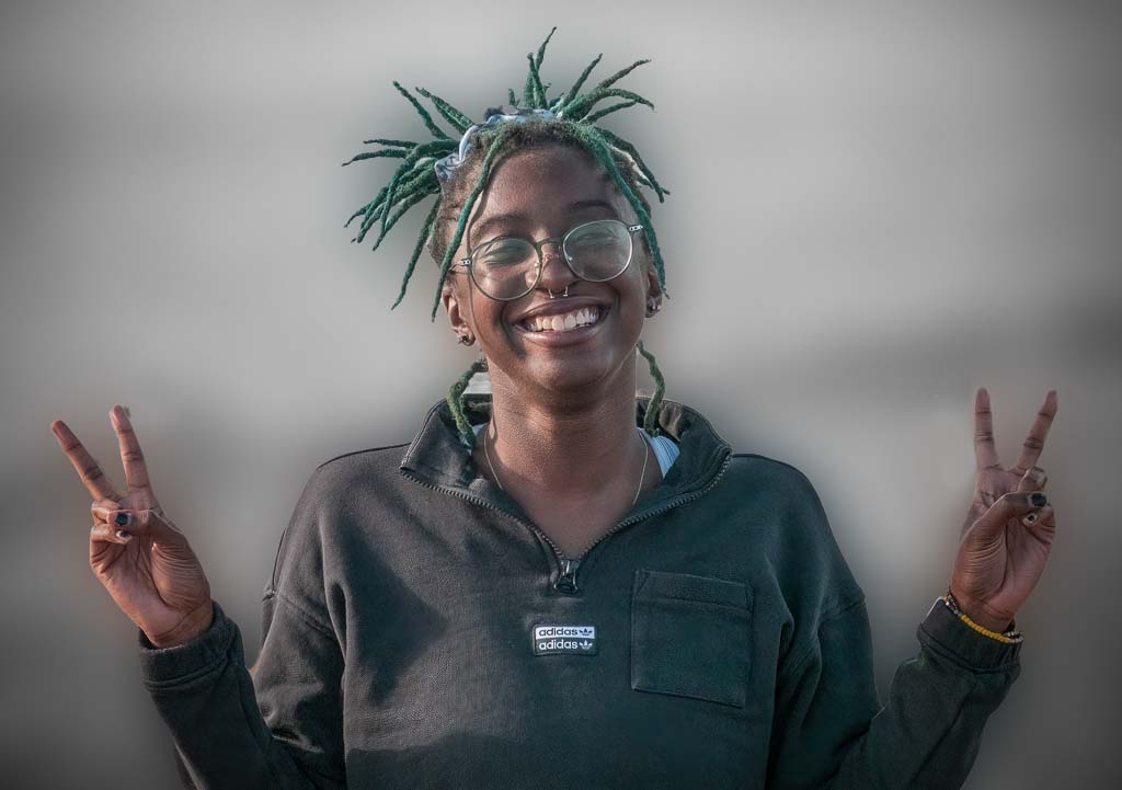 Totally agree that her smile is amazing... Love the crazy color hair which also speaks to her being a free spirit. I am wondering if you considered changing the background to black and white so that the story is all about her...and her amazing smile.