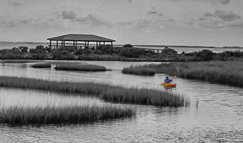 Joan, this is some amazing editing and seeing beyond what has come out of your camera! The composition greatly enhanced what would have need a very mundane image. I would like to see a bit more drama in the sky. Also, I wonder if you considered keeping the color of the kayaker. Please excuse my poor editing of your original. I just wanted to see that if would look like with this bit of color. |