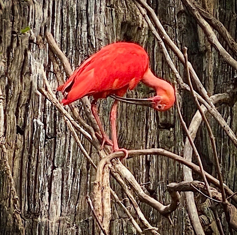 Kathleen, this is a great image. The color of the Scarlet against the texture of the background really makes him pop. I do like your removal of the leaves. I also think that flipping added to your finished image. The only other editing I might have considered was making the image more of a square and adding a vignette. |