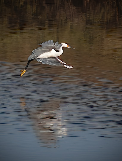 Walter, you were able to get great details in the feathers and face of the bird. The catch light in the bird's eye brings him/her to life. I feel that the darken background robs us of the beauty of this setting. I also feel that including the reflection would add to the image. It just looks so serene in this natural setting. |