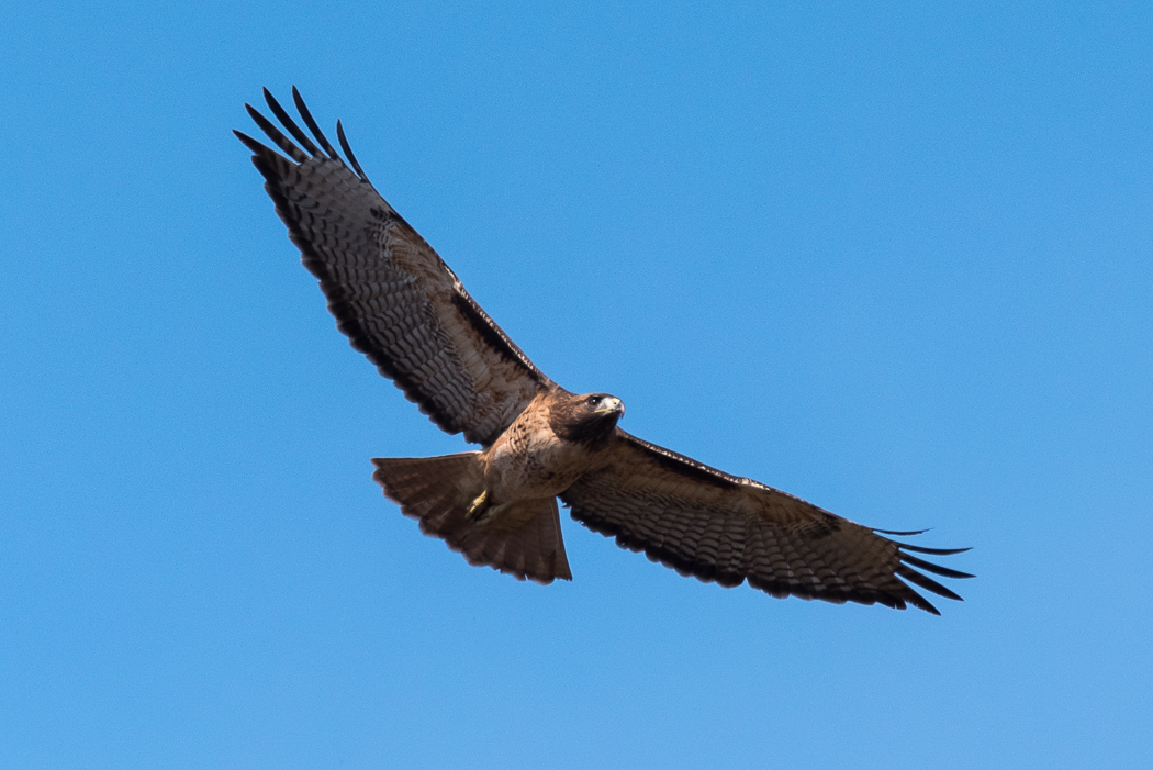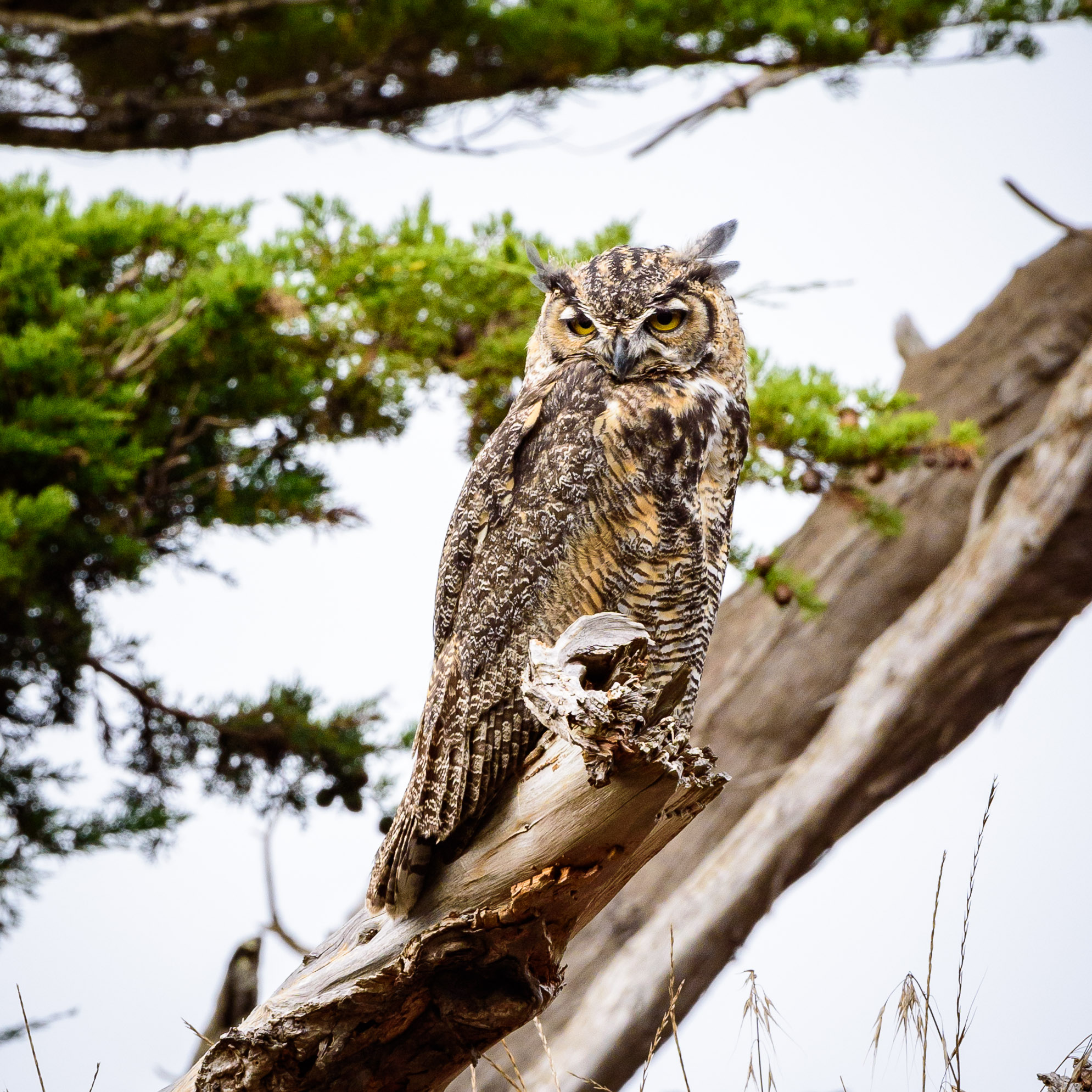 Bruce -- I was very lucky to come across this owl. He was about 8 ft above the ground. The day was overcast with low fog resulting in a uniform brightness; not what a photographer wants but with an owl this close I was not about to fuss. |