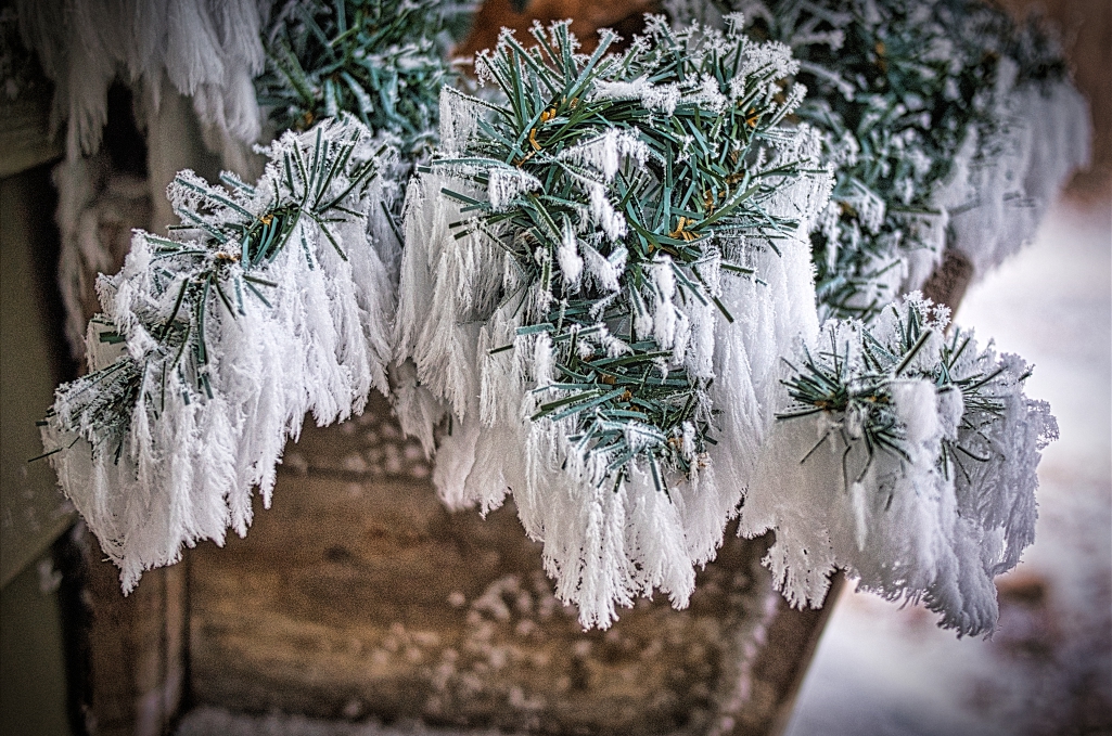 The subject is not the leaf. Let's try a different shot of the hoarfrost. Used EasyHDR to get more detail. |