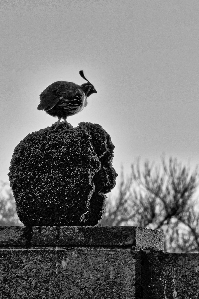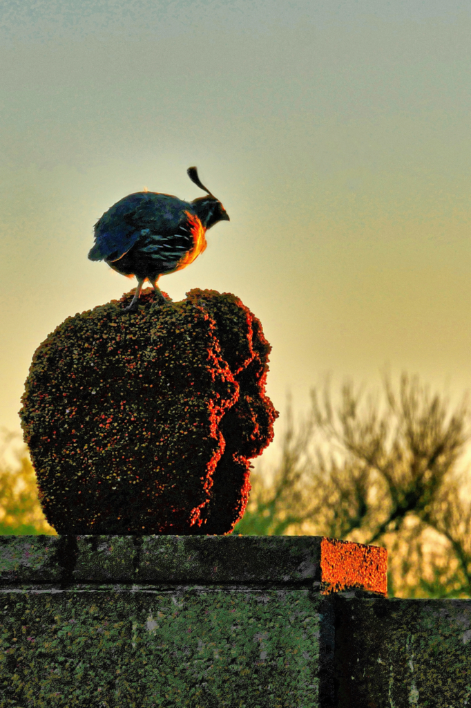 In the original, there is a diagonal line formed by the upper left bush downward to the bird and post. The background's blur would highlight the bird's clarity.