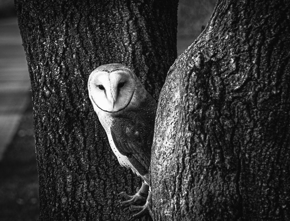 Owls are fun to photograph. Nice composition and I agree that a portrait orientation would be nice. I also like the monochrome conversion but find it a little "blue" for my taste. I like it better in full dynamic range in Silver Effects Pro. Either way, great capture. |