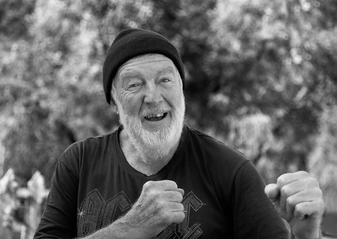 Great capture of a character. I would convert it to b&w where his eyes twinkle. There is a spot on this shirt that is distracting on the B. I'd remove it. I've just done a quick play for consideration.