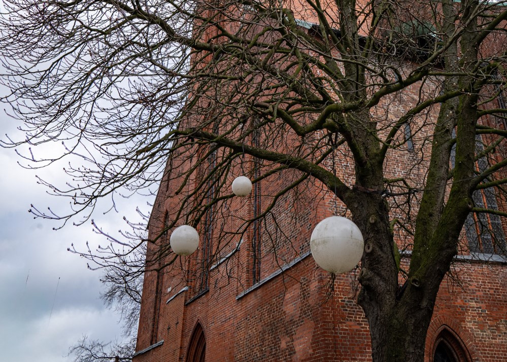 Hum, interesting. I'm not sure what is the subject of this photo as I vacillate from the church, the branches and the balls. Then again, the sky is pretty great also.