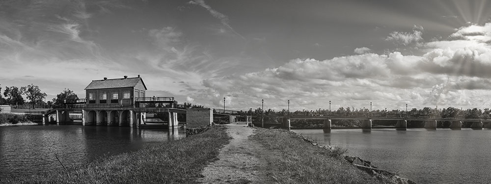 On further thoughts, I think the compositional flaws of the panorama are distracting as you point out. I have revised the image by taking out the distracting leading line "to nowhere" and have balanced the dam house with the sun so that there is less intervening space. |