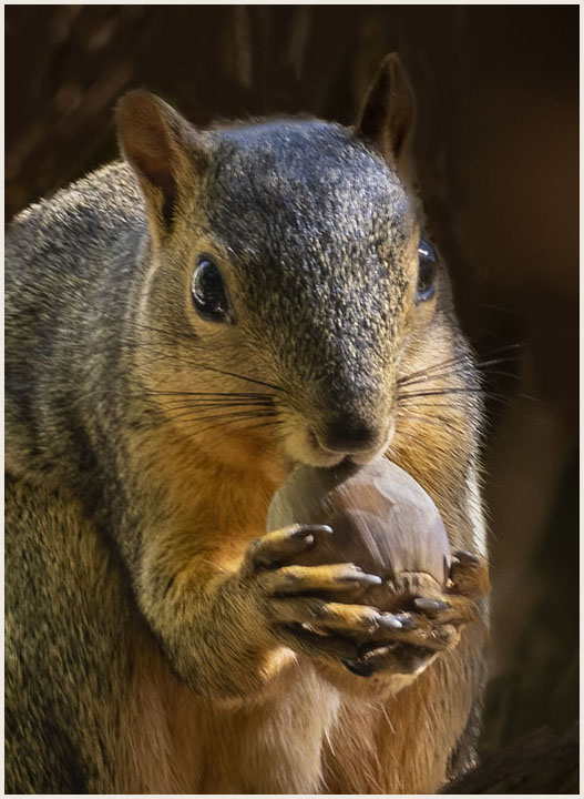 The focal length was 400mm. I took a few bursts at different angles and during that time the squirrel moved about and took bites out of the acorn, so this shot seemed the best expression of "pride in the catch" as it were. Since Martin Nature Park does not permit dogs the squirrels are much tamer!