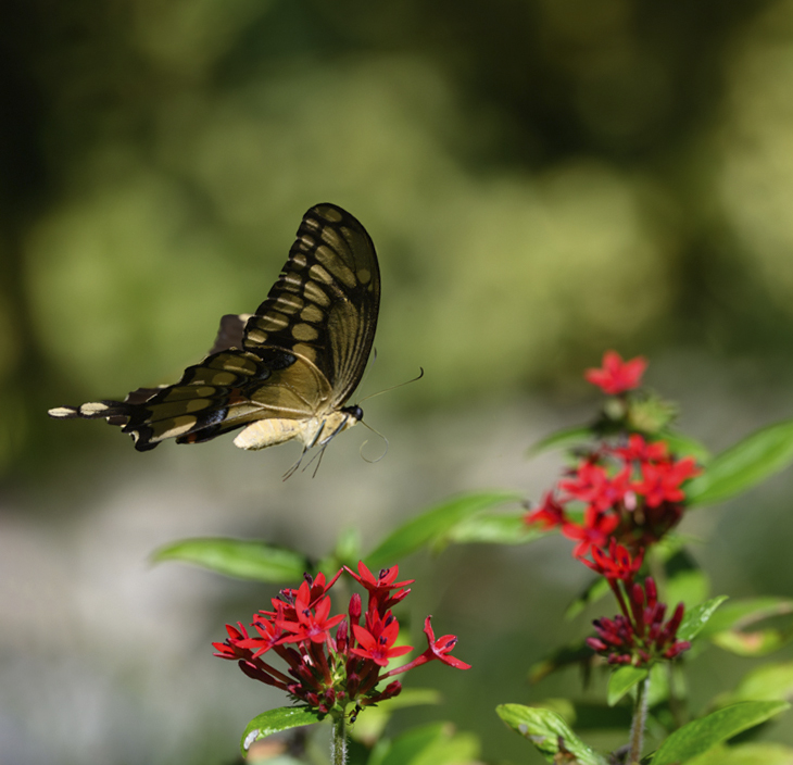 The butterfly shows movement and expression in the leg and proboscis positions and is justified in getting the focus of attention. It is complimented by the red flowers but in some ways there is competition. One way to resolve this could be to take out the top right flower, free transform the butterfly and move it down. Then crop up to below the two red flowers to give the butterfly a more central position in the picture. |