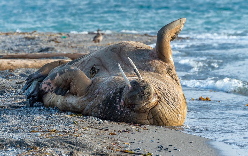 Hey Isaac, you present a really nice nature image of a not often seen subject. Being on it's back adds to the interest. For me the harsh side light and mostly mid tone colors make a lack of contrast so is difficult to see the left side of the walrus. Still a very nice image with lots of interesting details to look at. I worked a bit on the bright areas and dark areas in camera raw to help with contrast, not sure if it helped or not. Bruce |