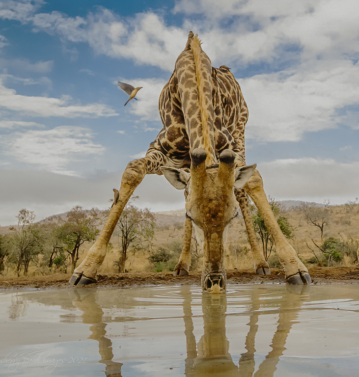 Peter, this is the most unusual perspective, were you at ground level with him? Certainly appears to be the. case. I also love the Oxpecker in flight and in fact there is also one on his leg. . My one suggestion is you might want to take the highlights down some. It is very bright and lowering the whites would give more detail. I am adding one that I lowered the White Balance and took the highlights down to 0. I also played with the histogram to recover the sky. The image is nice and by correcting the white balance it becomes much more relaistic. |