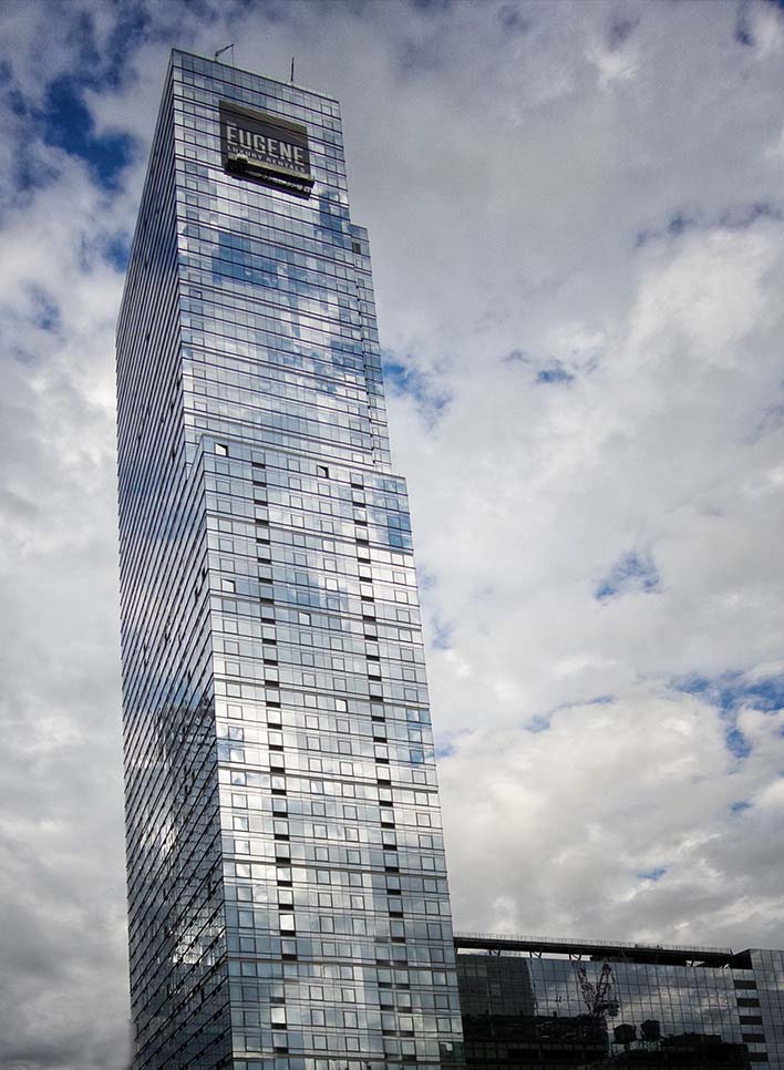 I think that the angle of the building creates a tension in the photo that makes it interesting. The reflections of the clouds off the building gives it a nice feel and depth in my opinion. Focus and exposure look good to me.