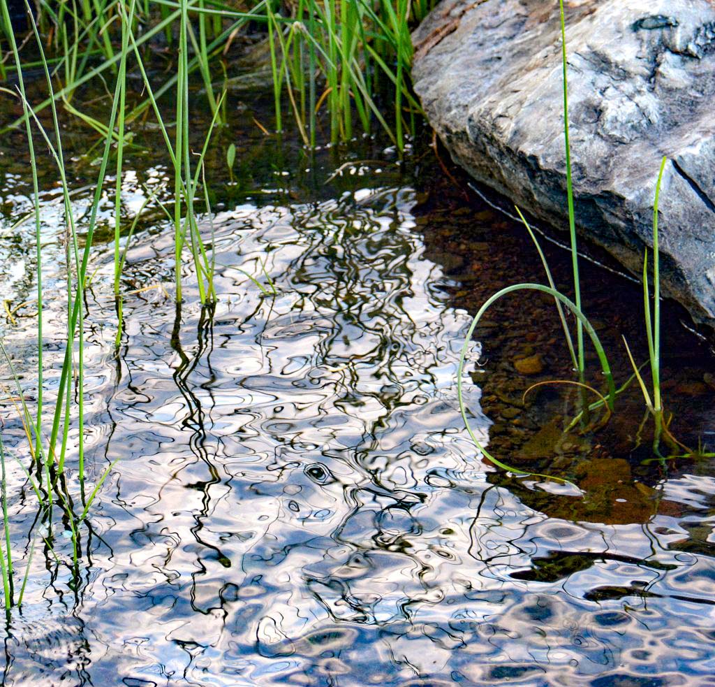 I think this is a very interesting composition. My eyes want to wander and explore the reflections. The grass and rock give it a sense of place in my mind.