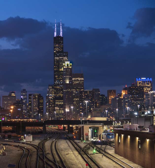 I very much like the idea of the skyline at night. The clouds and sky offer an interesting contrast in my mind. I think the RR tracks act a good leading line into the skyline. Exposure and focus look good to me.