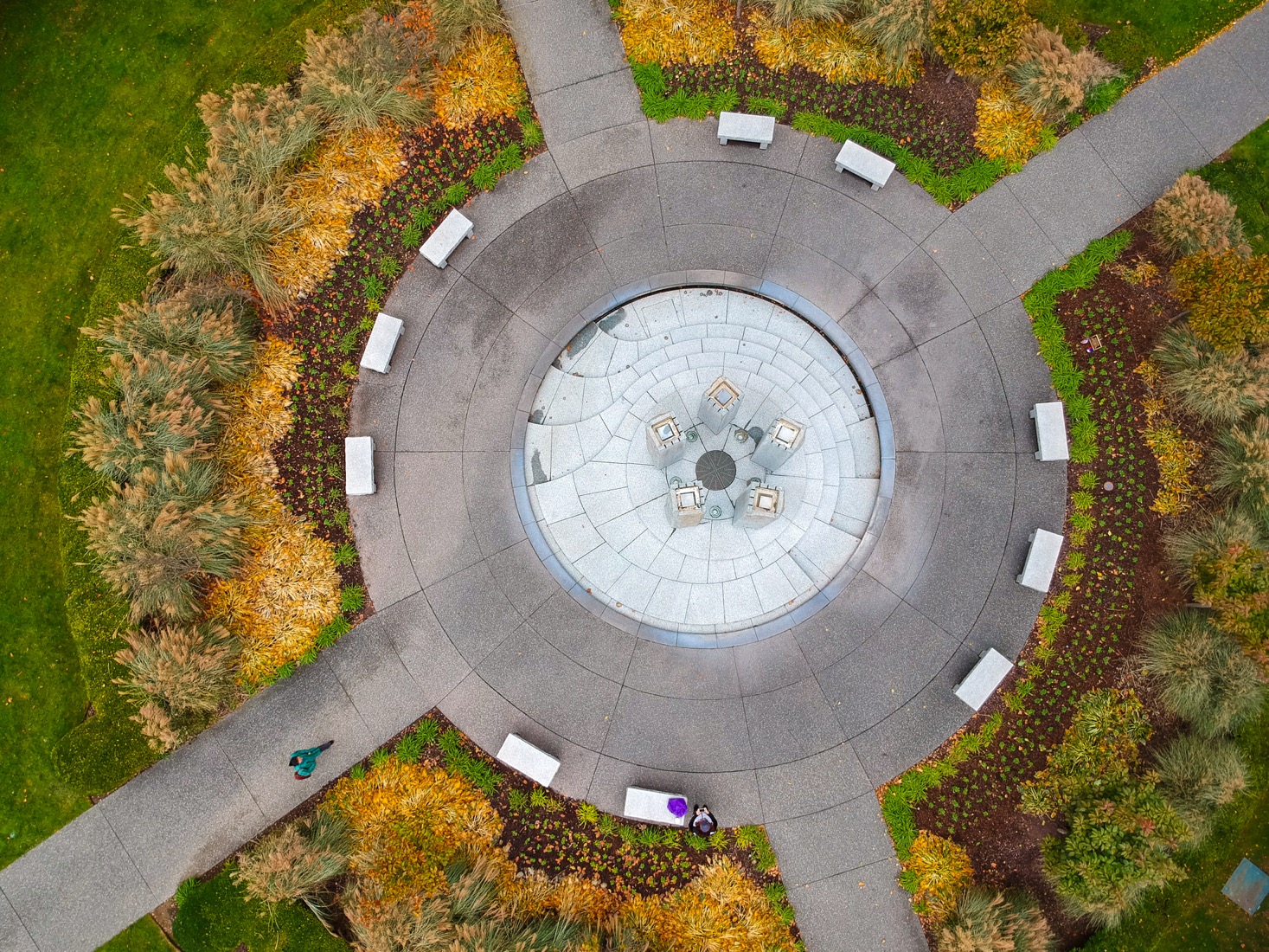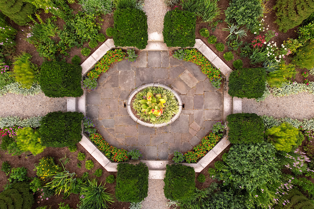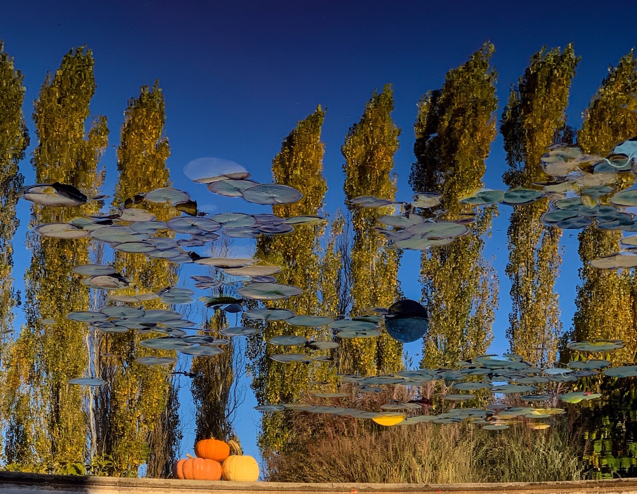 It is a mind-twister, Randolph. Even I get confused on how I took this shot lol. The dark circle, which of course half is reflection, is the sprinkler head. I'll have to go back when it's on and see how it looks. And I don't believe those are stacked bottles on the lower right, just reflections of leaves on the bushes closer to the water.
